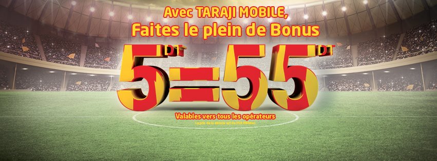 إذا تتحفكم خدمة ترجي موبيل بزيادة ( bonus ) رائعة , حيث تقدّم لكم زيادة ب55 د.ت , على كلّ قيمة شحن بخمسة دنانير . و هذا العرض صالح نحو كلّ المشغّلين .