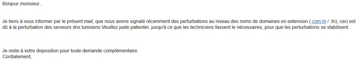 خلل مفاجئ أصاب أغلب أسماء النّطاقات ( noms de domaines) على العناوين “tn.” و “com.tn.” من المستوى الثّاني . حيث أنّها متوقّفة عن العمل كلّيا منذ دقائق.