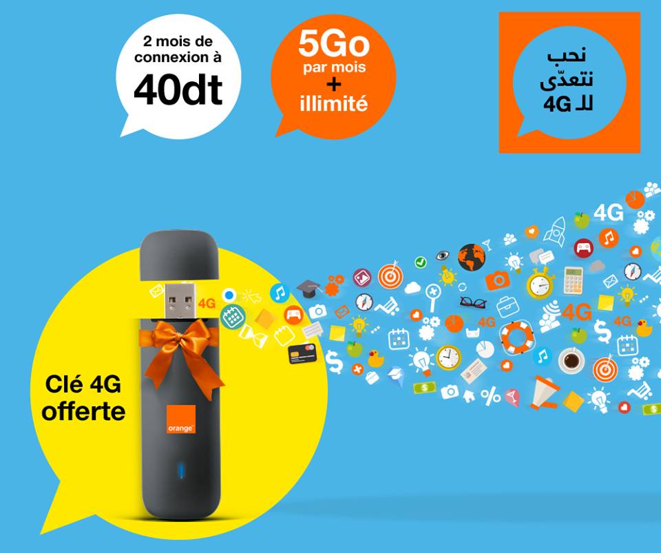 أيضا , سيكون لديكم إتّصاليّة بالإنترنت ( Connexion ) بسعة 5 جيقا-أوكتي كلّ شهر ب40 دينار فقط , و المميّز هو أنّكم ستتحصّلون على مفتاح إنترنت Clé 4G مجّانا !