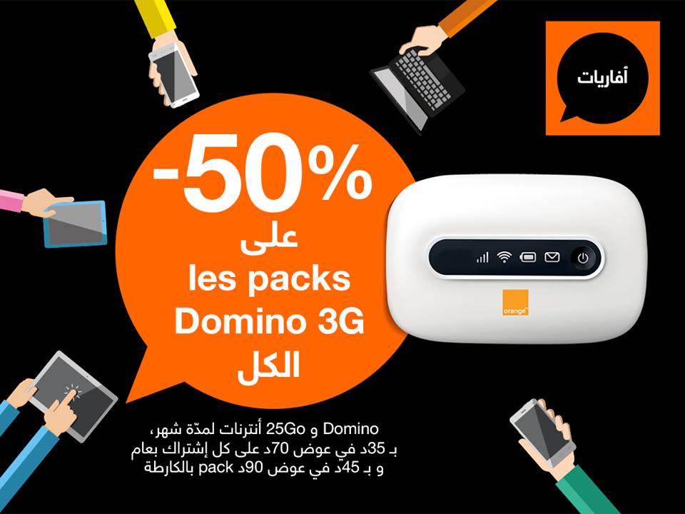 أطلق مشغّل الإتّصالات الرّائد أورانج تونس, منذ سويعات, عرضا تجاريّا جديدا يهمّ باقات Domino 3G للإنترنت, حيث طرحت تخفيضا بنسبة 50 % يمكّنكم من التّمتّع بباقة Domino 3G مع 25 جيقا كمقدار إنترنت لمدّة 30 يوما, مقابل 35 د عوضا عن 70 دينار على كلّ إشتراك بعام !