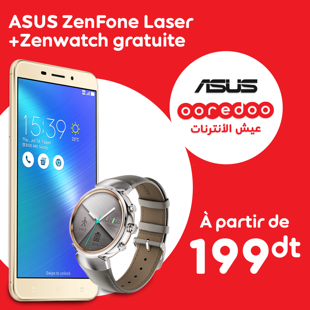 هذا العرض الجديد سيمكّن من التّمتّع بالهاتف الذّكيّ ZenFone Laser من Asus , إضافة إلى ساعة اليد ZenWatch مجّانا . و ذلك مقابل سعر ينطلق من 199 د ( في إطار فاتورة شهريّة بقيمة 200 د , في إطار عقد إلتزام يمتدّ على عامين) مع العديد من الإمتيازات للإنترنت و المكالمات .