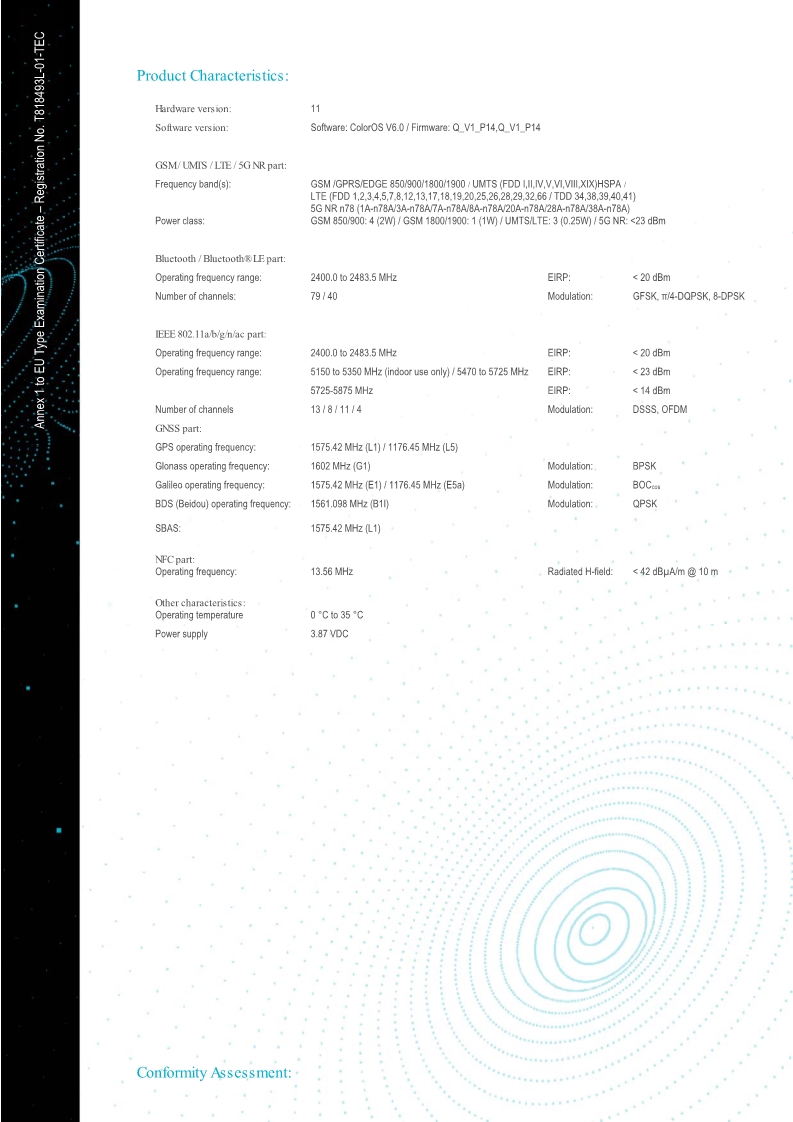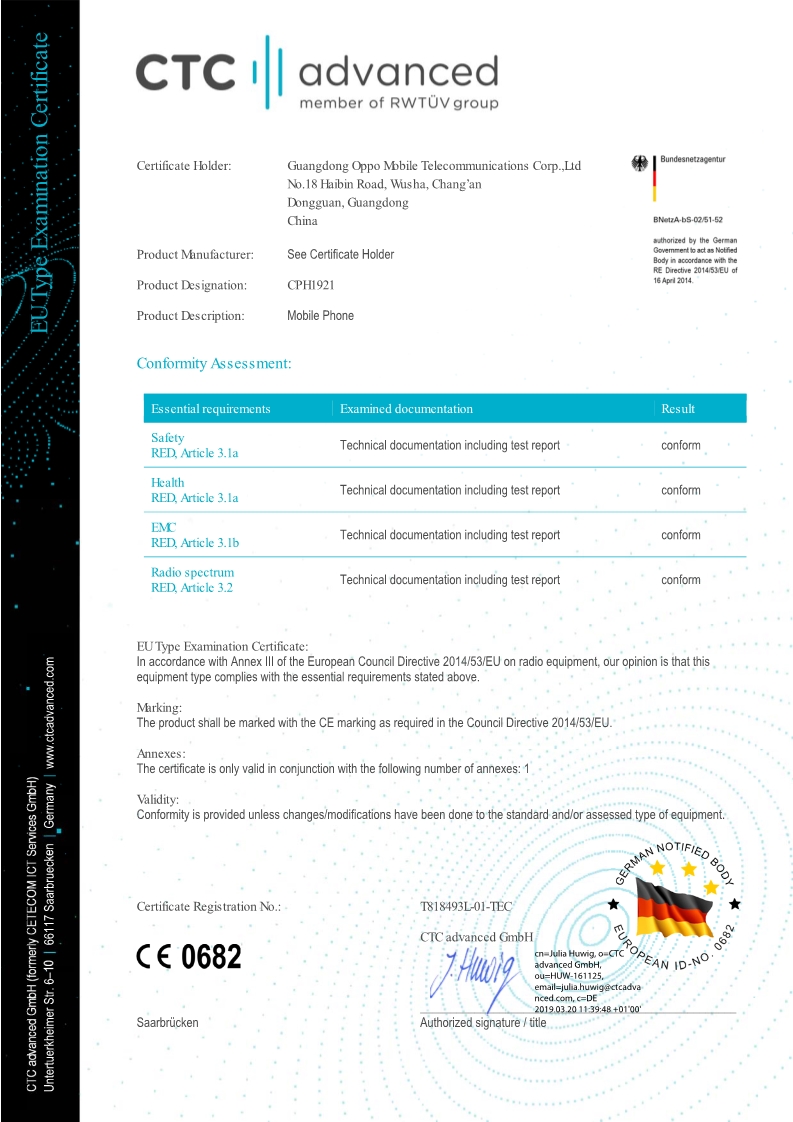 وباعتبارها خطورة جوهرية نحو الطرح التجاري لهاتفها الذكي العامل بتقنية الجيل الخامس في أوروبا، يأتي حصول OPPO على شهادة المطابقة الأوروبية CE تأكيداً على توافق الجهاز مع المعايير الأوروبية الأساسية لدخول الأسواق الأوروبية في مجالات منها الاتصال اللاسلكي، التوافقية الكهرومغناطيسية، والصحة والسلامة. ويتمتع الهاتف بمزايا الحزمة N78 ومنها توليفات أوسع للحزم، وحزمة عريضة أكثر اتساعاً، والتي يمكن تطبيقها ضمن عدد أكبر من البلدان والمناطق.