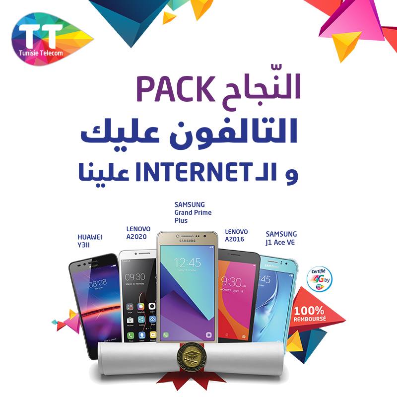 هذا العرض أتى في إطار باقة ( النّجاح pack ) , تتيح لكم التّمتّع بهاتف ذكيّ محترم المواصفات, مع ميزة ( 100% remboursé) , الّتي تمكّنكم من التّمتّع بقيمة الهاتف في شكل رصيد إنترنت و مكالمات و غيرها .