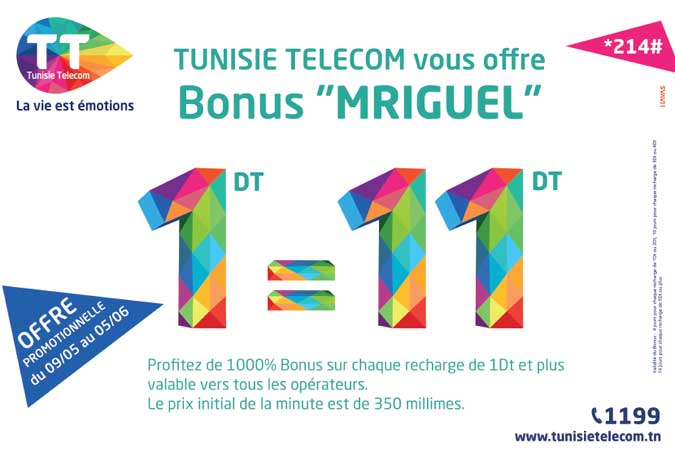 أطلق مشغّل الإتّصالات الوطني ” إتّصالات تونس ” منذ يومين عرضا جديدا تخفيضيّا يتمثّل في زيادة ( bonus ) تحمل إسم ” مريقل ” أو ” Mriguel ” , و هو مخصّص لمشتركي خطوط الهاتف الجوّال مسبق الدّفع .