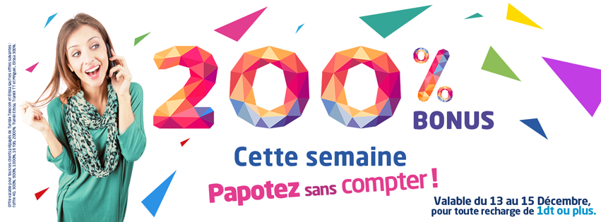 في إطار سياسته الرّامية إلى إرضاء حرفائه بأفضل العروض على مستوى المكالمات الهاتفيّة , أطلق مشغّل الإتّصالات الوطني “إتّصالات تونس” منذ قليل عرضه التّجاري التّخفيضي الجديد ( 200 % Bonus ) .