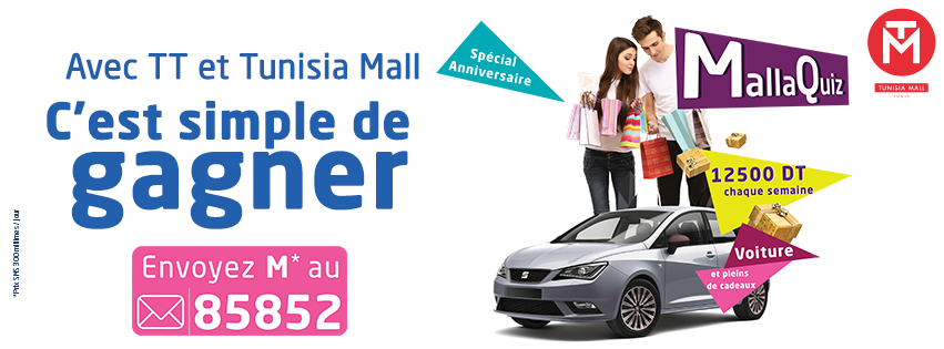 مسابقة Malla Quizz ستمكّنكم أسبوعيّا من الفوز بمبالغ ماليّة هامّة تبلغ قيمتها 12500 د , إضافة إلى إمكانيّة ربح سيّارة من نوع seat IBIZA شهريّا . مع إمكانيّة الفوز بسيّارة من نوع Golf 7 في آخر السّحب.