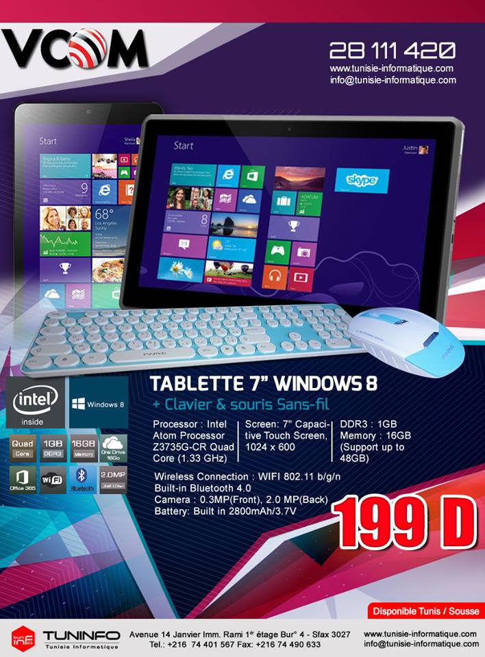 هذا الجهاز اللّوحي ( Tablette ) من نوع VCOM 7 ” Windows 8 , مع لوحة مفاتيح و فأرة لاسلكيّة , الكلّ ب199 د فقط .