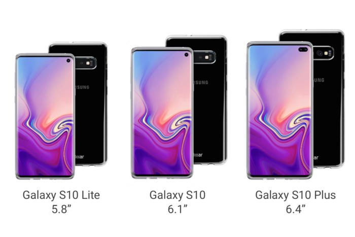 يتميز هاتف Galaxy S10 بشاشة عرض مصفوفة عضوية نشطة ذات صمام ثنائي باعث للضوء Infinity O بحجم 5.8 إنش، أما هاتف +Galaxy S10 فيأتي مع شاشة عرض أكبر حجما بحجم 6.44 إنش. وتتميز كلا شاشة الهاتفين بدقة ووضوح عاليين ونسبة باعية 19:9. في حين ينطوي الهاتفان على مستشعر بصمات أصابع فوق صوتي داخل الشاشة الذي تقول الشركة بإنه أسرع بكثير من مستشعر بصمات الأصابع الصوتي الذي يتميز به هاتف هواوي Mate 20 Pro وهاتف OnePlus 6T. كما يعمل الهاتفان باحدث معالج من شركة Qualcomm من نوع Snapdragon 855، في حين أن النسخة العالمية ستكون مزودة بمعالج Exynos. أما فيما يتعلق بذاكرة التخزين، فسيتوفر هاتف Galaxy S10 مع خياري ذاكرة وصول عشوائي (6GB/8GB) بالإضافة إلى خياري ذاكرة تخزين داخلي (128GB/512GB)، في حين يأتي هاتف +Galaxy S10 مع ثلاثة خيارات ذاكرة وصول عشوائي (6GB/8GB/12GB) بالإضافة إلى ثلاثة خيارات ذاكرة تخزين داخلي (128GB/512GB/1TB). كما تأتي جميع النسخ مزودة بمأخذ بطاقة ذاكرة microSD تعمل على توسيع طاقة التخزين بالإضافة إلى مكبر صوت ستيريو ومنفذ USB-C. أما فيما يتعلق بكاميرا الهاتفين، فإن كليهما مزود بكاميرا خلفية ثلاثية بدقة 12MP+12MP+16MP، في حين أن هاتف Galaxy S10 مزود بكاميرا أمامية واحدة بدقة 10MP. وفي الوقت الذي يتميز فيه هاتف Galaxy S10 ببطارية بقوة 3500mAh فإن هاتف +Galaxy S10 ينطوي على بطارية بقوة 4100mAh. ويتوفر هاتف Galaxy S10 بجميع نسخه في كل من الألوان التالية: Prism White و Prism Black و Prism Green و Prism Blue و Canary Yellow و Flamingo Pink، أما هاتف +Galaxy S10 فيتوفر باللونين Ceramic White و Ceramic Black.