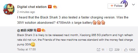 يشير منشور على موقع التواصل الإجتماعي Weibo إلى أن شركة Black Shark الصينية قد تعلن الشهر القادم عن هاتف جديد يعتقد بأنه هاتف Black Shark 3 المخصص للعب.