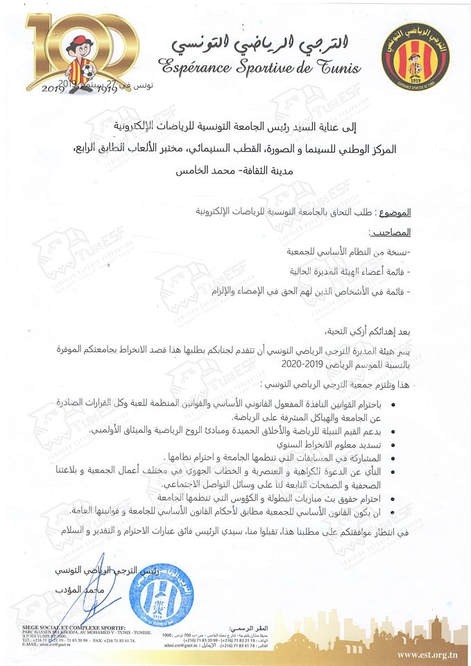 أعلنت اليوم الثلاثاء 5 نوفمبر 2019 الجامعة التونسية للرياضات الإلكترونية TunESF تلقىها لطلب عضوية رسمي من طرف نادي الترجي الرياضي التونسي الذي كلل بالموافقة.