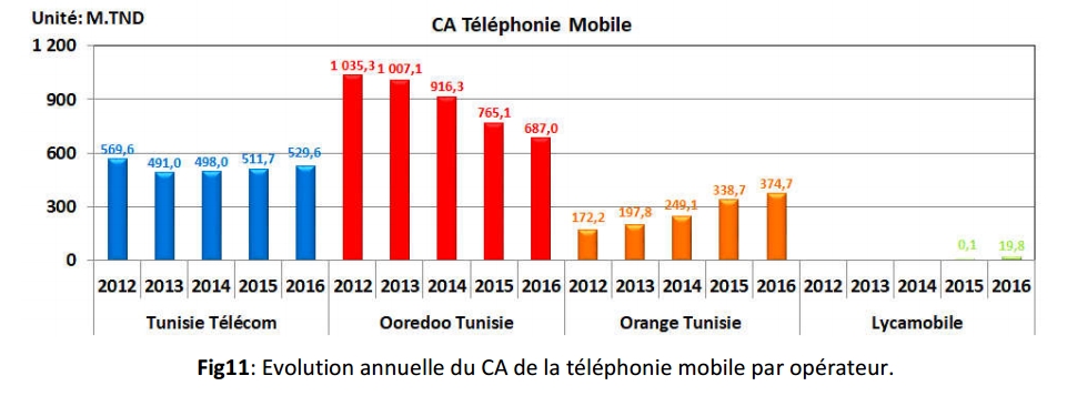 أعلنت الهيئة الوطنيّة للإتّصالات (INT) عن تقريرها الخاصّ بالتّطوّر السّنوي لرقم المعاملات الماليّ (chiffre d’affaire) الخاصّ بمشغّلي الخطوط الجوّالة الأربعة في السّوق التّونسيّة ( إتّصالات تونس, أوريدو و أروانج و كذلك لايكا موبيل).