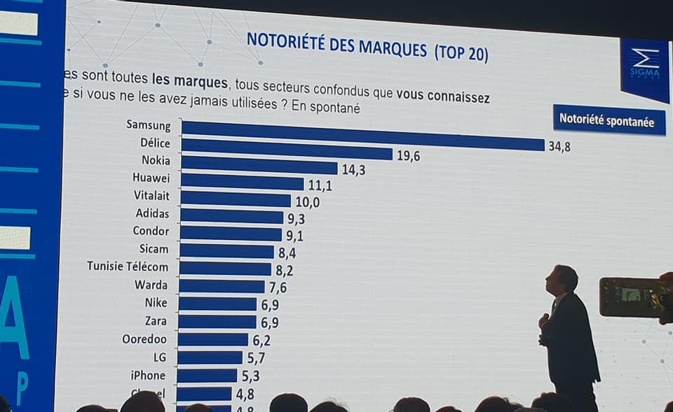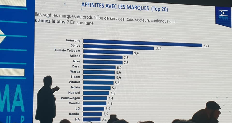 يفيد سبر الآراء الأخير لمؤسسة Sigma Conseil في علاقة بالوعي التجاري (Brand Awareness) للمواطن التونسي أن 23.4% من التونسيين يفضلون علامة Samsung على بقية العلامة التجارية، في حين احتلت Delice المرتبة الثانية بنسبة 13.5% يليها بعدها اتصالات تونس بنسبة 9.4%.