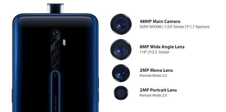 يأتي هاتف OPPO Reno2 مع شاشة AMOLED عالية الدقة بحجم 6.5 إنش مجهزا بمعالج من نوع Snapdragon 730G. كما ينطوي الهاتف على ذاكرة وصول عشوائي بسعة 8GB وعلى ذاكرة تخزين داخلي بسعة 256GB قابلة للتوسع عن طريق بطاقة ذاكرة MicroSD. هذا ويحتوي الهاتف أيضا على كاميرا أمامية منبثقة بدقة 16MP وعلى كاميرا خلفية رباعية التي تتألف من مستشعر رئيسي من نوع Sony IMX586 بدقة 48MP ومن عدسة ذات زاوية موسعة بدقة 8MP إلى جانب عدسة أحادية اللون بدقة 2MP وعدسة تكبير بقيمة 5X وبدقة 13MP. زد على ذلك أن الهاتف مجهز بماسح بصمات أصابع داخل الشاشة ومزود ببطارية بقوة 4000mAh داعمة لميزة الشحن السريع بقوة 20 وات. أما فيما يتعلق بسعر الهاتف، فإن هاتف OPPO Reno2 سيتوفر إبتداء من 20 من شهر سبتمبر بسعر 515 دولارا.