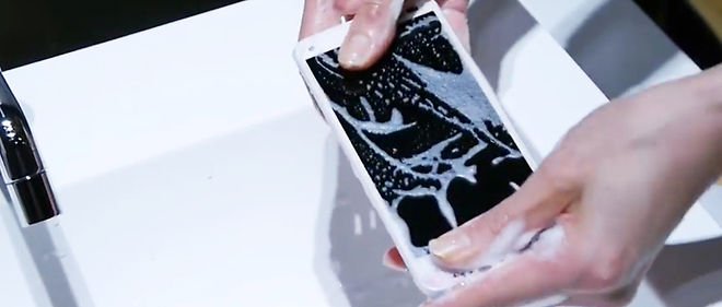 و قد كشفت KDDI ,بالمناسبة , عن مقطع فيديو إشهاري بهدف إثبات مواصفات هاتفها . هنة واحدة : هذا الهاتف ليس مقاوما لكلّ أنواع الصّابون . بل هو متلائم مع بعض أنواع المنتجات فقط .