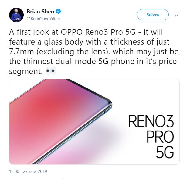 شارك بالأمس “براين شين” نائب رئيس شركة OPPO على صفحته الرسمية على موقع التواصل الإجتماعي تويتر صورة لهاتف Reno 3 Pro 5G المتوقع الإعلان عنه في MWC 2020.
