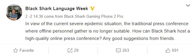 مع إقتراب موعد الإعلان عن هاتف Black Shark وسلسلة الهواتف Mi 10 والمقرر في شهر فيفري، اشارت عدة تقارير إلى أن عددا من العلامات التجارية ومن بينها شاومي و Black Shark تدرس خيار عقد حدث إعلان عبر الإنترنت وذلك بسبب تفشي فيروس الكورونا في الصين.