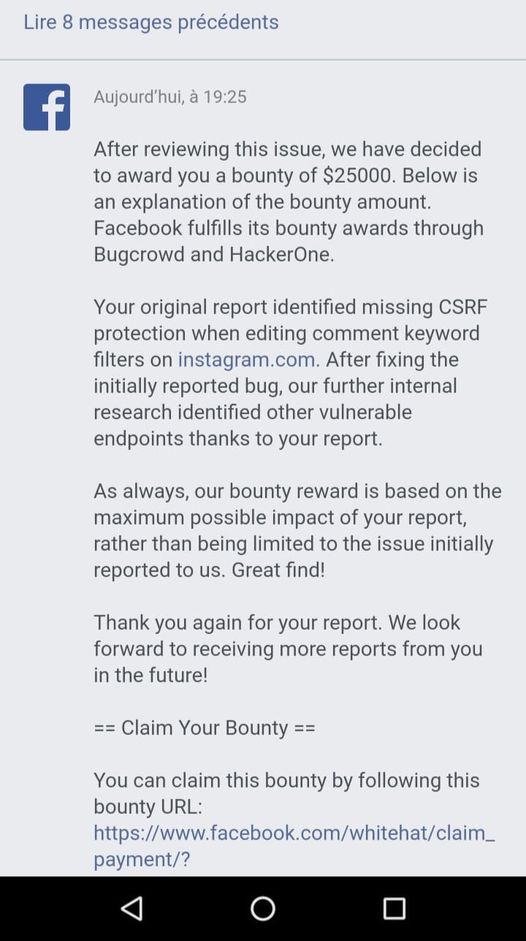 وقد رصدت له شركة فايسبوك بناءا على ذلك مكافأة بقيمة 25 ألف دولار.
