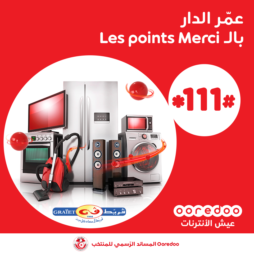 إذا, يقدّم برنامج نقاط Merci من Ooredoo عرضه الجديد الّذي يمكّنكم الآن من تأثيث منزلكم بمختلف التّجهيزات الكهرومنزليّة و ذلك عبر تحويل رصيدكم من نقاط Merci , عبر الضّغط على الرّمز #111*