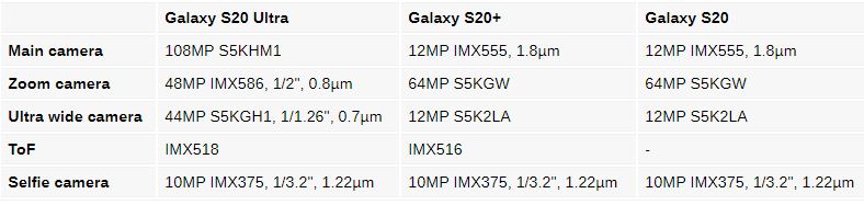 ووفقا لأخر التسريبات ، كشف المسرب الشهير IceUniverse عن إعدادات كاميرا كل من هاتف سامسونج Galaxy S20 Ultra و هاتف سامسونج +Galaxy S20 وهاتف سامسونج Galaxy S20 الموضحة في الجدول أسفله .