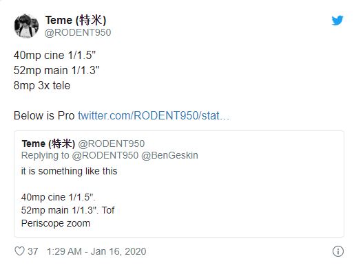 كما كشفت التغريدة أيضا على إعدادات كاميرا هاتف P40 Pro الرباعية والتي ستتركب من مستشعر رئيسي بدقة 52MP من عدسة سينمائية بدقة 40MP بالإضافة إلى عدسة مئفاقية ومستشعر تصوير فراغي ToF.