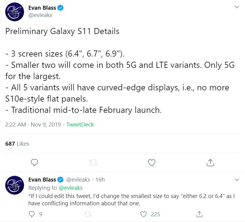تشير تغريدة للمسرب الشهير “إيفان بلاس” على موقع التواصل الإجتماعي تويتر إلى أن سلسلة الهواتف سامسونج Galaxy S11 ستضم على الأقل خمس موديلات وهي كالتالي: