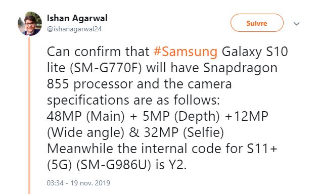 مع إقتراب موعد الإعلان عنه ، نشر منذ يومين المسرب “ايشان اغاروال” (@Ishanagarwal24) على صفحته الرسمية على موقع تويتر تفاصيل كاميرا هاتف سامسونج Galaxy S10 Lite.