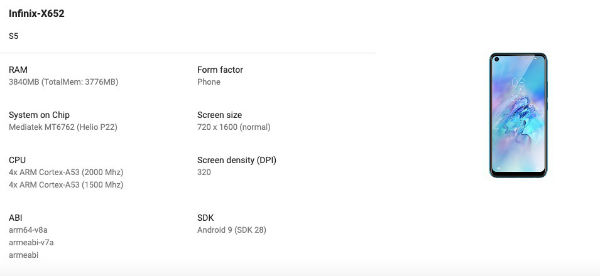 ووفقا لموقع Google Play Console ، فإن هاتف Infinix Hot S5 سيأتي مع شاشة Punch Hole بدقة 1600×720 بيكسل مجهزا بمعالج من نوع Helio P22 وبذاكرة وصول عشوائي بسعة 4GB. كما سينطوي الهاتف المرتقب على الأرجح على كاميرا أمامية مشابهة لكاميرا هاتف VIVO Z1 Pro بدقة 32MP وعلى كاميرا خلفية رباعية ذات مستشعر رئيسي بدقة 48MP. زد على ذلك أن الهاتف سيعمل بنظام Android Pie إلى جانب كونه مزودا ببطارية بقوة 5000mAh.