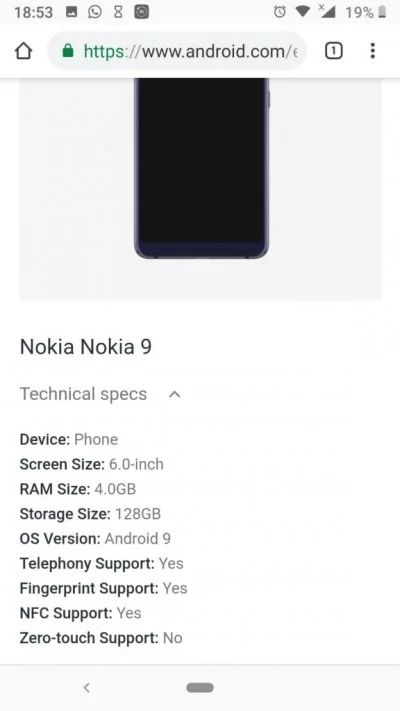 ووفقا للقطة الشاشة أسفله، فإن هاتف Nokia 9 Pureview يتميز بشاشة بحجم 6 إنش ومزود بمعالج لم يذكر اسمه بالإضافة إلى ذاكرة وصول عشوائي بسعة 4GB. أما ذاكرة التخزين الداخلي فتبلغ سعتها 128GB وهي دليل عن أن المواصفات المذكورة على الموقع تعود إلى النموذج الأولي للهاتف، إذ من المحتمل أن ينطوي الهاتف على نسخة أخرى ذات ذاكرة وصول عشوائي بسعة 6GB. كما سيدعم الهاتف الذي يحتوي على ماسح بصمات أصابع ميزة التواصل قريب المدى (NFC) إلى جانب غيرها من الميزات الأخرى. وفي الوقت الذي تأتي فيه جميع الهواتف الرائدة مدعومة بنظام أندرويد ومعالج من نوع Snapdragon 855، فإن هاتف Nokia 9 PureView القادم مزود بمعالج Snapdragon 845.