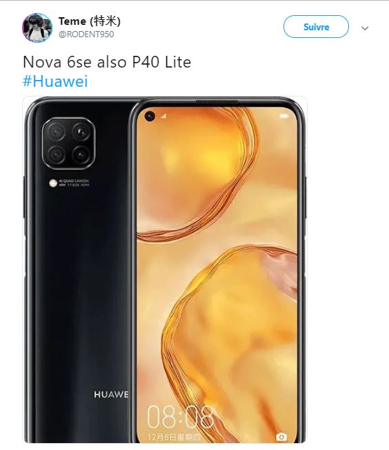 تشير تغريدة على موقع التواصل الإجتماعي تويتر إلى أن تصميم هاتف هواوي P40 Lite المرجح الإعلان عنه بعد اسابيع معدودات ضمن سلسلة الهواتف P40 سيحاكي تصميم هاتف هواوي Nova 6 SE المعلن عنه مؤخرا.