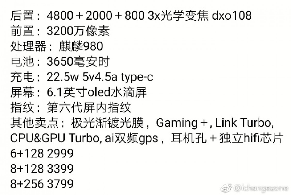 ومن المتوقع أيضا أن يضم الهاتف المجهز بمعالج Kirin 980 العديد من الميزات مثل ميزة +Gaming و ميزة نظام تحديد المواقع ثنائي تردد بالإضافة إلى كل من ميزة GPU Turbo و CPU Turbo و Link Turbo. كما يرجح أن يأتي الهاتف مع شاشة OLED بحجم 6.1 إنش ذات ثلمة بحجم قطرة ومع بطارية بقوة 3650mAh داعمة لميزة الشحن السريع بقوة 22.5 وات. أما فيما يتعلق بالأسعار، فيقال أن نسخة الهاتف ذات ذاكرة الوصول العشوائي بسعة 6GB وذاكرة التخزين الداخلي بسعة 128GB ستتوفر بسعر 447 دولارا (أي 1360 دينارا) أما نسخة الهاتف ذات ذاكرة الوصول العشوائي بسعة 8GB وذاكرة التخزين الداخلي بسعة 256GB فستتوفر بسعر 566 دولارا (أي 1723 دينارا).