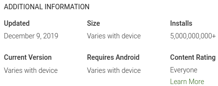 ووفقا لمتجر Google Play الذي لا يظهر العدد الدقيق لتنزيلات التطبيقات وإنما يعتمد نطاقات تصنيفية ، فإن تطبيق Whatsapp قد إلتحق مؤخرا بأكبر نطاق تصنيفي بقيمة تحميلات تتجاوز 5 مليار عملية تحميل. هذا وتجدر الإشارة إلى أن هذا النطاق يضم فقط 12 تطبيق معظمها ملك لشركة جوجل وتأتي مثبتة مسبقا على الهواتف الذكية بالطبع بإستثناء تطبيق فيسبوك و Whatsapp.