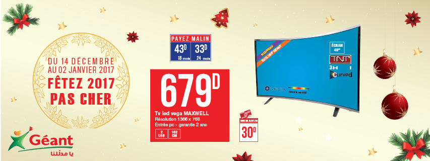بمناسبة فترة رأس السّنة , تتعدّد العروض التّجاريّة التّخفيضيّة الّتي تطلقها العديد من الشّركات التّكنولوجيّة . و في هذا الإطار , قدّمت شركة Maxwell بالتّعاون مع الفضاء التّجاري Géant , عرضا تخفيضيّا مميّزا لإقتناء تلفزيون ذكيّ من نوع Maxwell Vega.