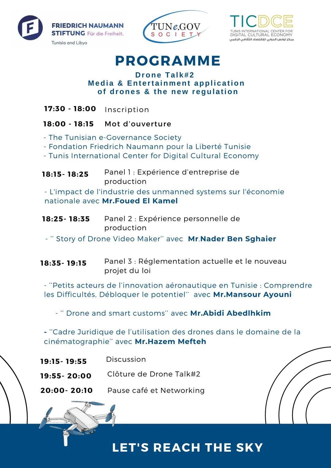 تنظّم الجمعيّة التّونسيّة للحوكمة الإلكترونيّة بالشّراكة مع مركز تونس الدّولي للإقتصاد الثّقافي الرّقمي, سلسلة نقاشات و ورشات عمل حول الطّائرات دون طيّار (DRONES).