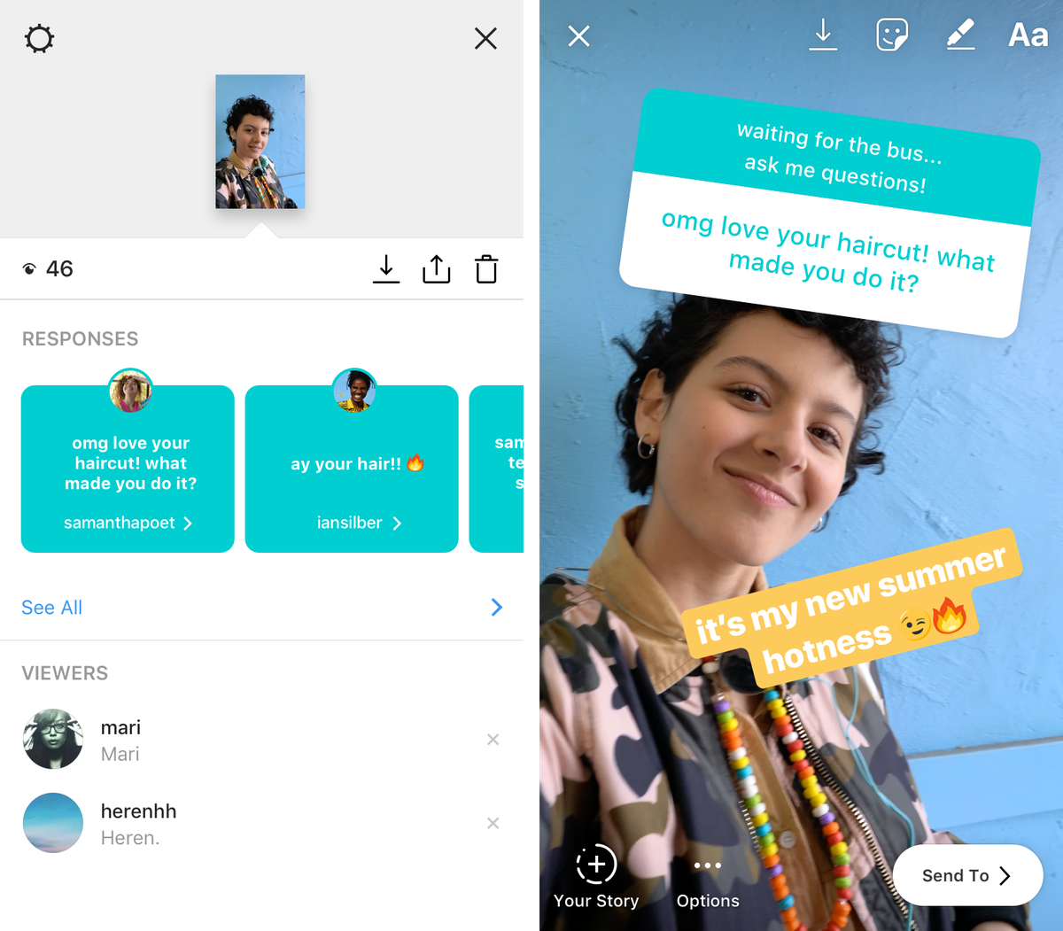 أعلنت إنستجرام مؤخرا عن إضافة جديدة متاحة لمستخدمي التطبيق. تتمثّل الإضافة في إمكانية وضع ملصقات تفاعلية تحمل أسئلة في قصص إنستجرام (Instagram Stories). كما تسمح للأصدقاء بإرسال أسئلة للمستخدم للإجابة عليها.