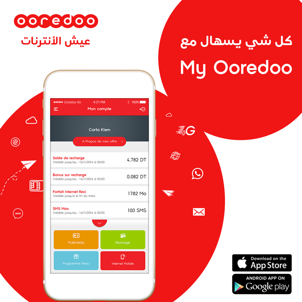 يقدّم مشغّل الإتّصالات الرّائد , أوريدو تونس, تطبيقة My Ooredoo الجديدة الّتي تساعد الحرفاء على التّعرّف على خطوطهم بشكل أكبر , إلى جانب إمكانيّة تتبّع رصيدهم و مقادير الbonus الخاصّة بهم . كما أنّها تمنح الحرفاء إمكانيّة الإختيار و شراء عروض الإنترنت الّتي تناسبهم بكلّ سهولة و في وقت أقلّ .