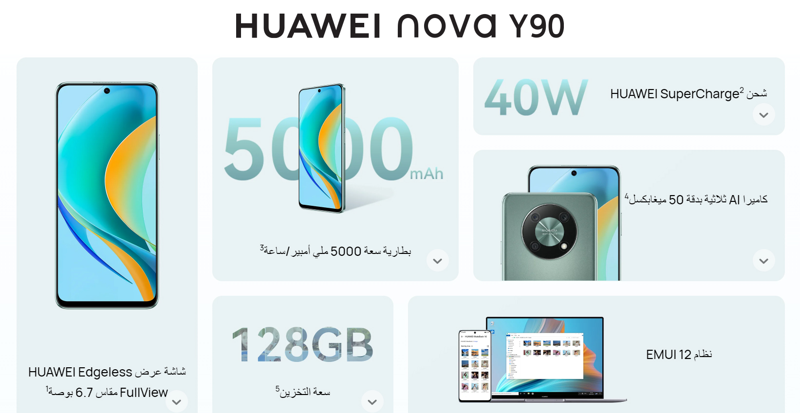 إذا كنت تحب الأجهزة التقنية الرائعة، وخاصة الهواتف الذكية الأنيقة، فإليك شيئا يجعلك متحمسا. أعلنت هواوي اليوم عن إطلاق أحدث هواتفها الذكية، HUAWEI nova Y90. إنه هاتف مثالي للمستخدمين الشباب الذين يبحثون عن تجربة مشاهدة غامرة، وعمر بطارية محسن مع HUAWEI SuperCharge1 بقوة 40 واط وبطارية كبيرة بسعة 5000 مللي أمبير في الساعة2. وما يجعله أكثر جاذبية سعة التخزين التي تبلغ 128 جيجابايت ونظام الكاميرا الثلاثية بدقة 50 ميجابكسل والتي تعمل بتقنيات الذكاء الاصطناعي، وهو أمر مثير للإعجاب.