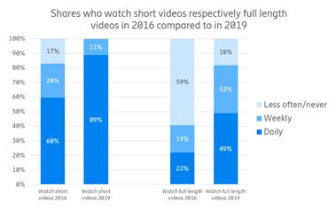 كما هناك 5 مستخدمين الهواتف الذكية من بين10 يشاهدون مقاطع فيديوكاملة في 2019 يوميًا، مقارنةً ب 2 فقط من بين 10 في 2016.