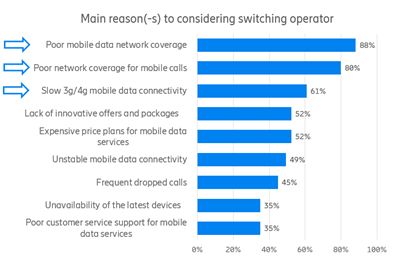و من بين الأسباب الرئيسية التي تدفع بمستعملي شبكات الهاتف النقال الي تغيير متعاملهم تاتي اولها تغطية الشبكة اذ يقول 9 مستهلكين من بين 10 أن التغطية هي السبب الرئيسي للتغيير فيما تعد تغطية الضعيفة للمكالمات عبر الشبكة هي السبب الثاني، بينما يقول 6 مستخدمين من ضمن 10 أنهم سيغيرون متعاملهم بسبب السرعة. ياتي سعرعروض البيانات في المرتبة الأخيرة.