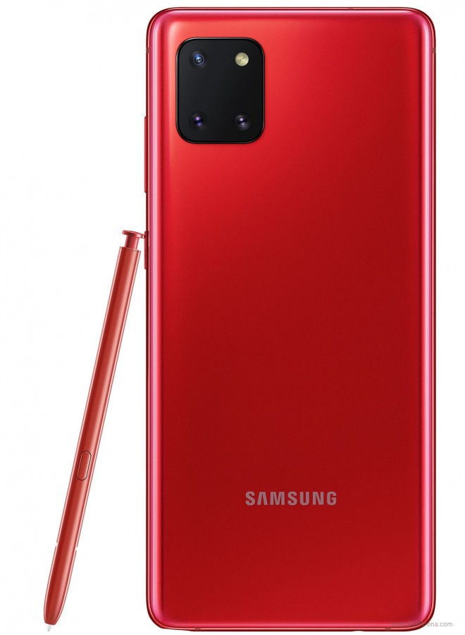 هذا ويحتوي الهاتف أيضا على كاميرا أمامية بدقة 32MP وعلى كاميرا خلفية ثلاثية مربعة الشكل التي تتألف من مستشعر رئيسي بدقة 12MP مع فتحة عدسة f/1.7 ومن عدسة ذات زاوية فوق موسعة بدقة 12MP مع فتحة عدسة f/2.2 إلى جانب عدسة تقريب بدقة 12MP مع فتحة عدسة f/2.4. زد على ذلك أن الهاتف مجهز بماسح بصمات أصابع داخل الشاشة ومزود ببطارية بقوة 4500mAh داعمة لميزة الشحن السريع بقوة 25 وات بالإضافة إلى عمله بنظام التشغيل Android 10 القائم على واجهة المستخدم One UI 2. أما فيما يتعلق بسعر الهاتف، فإن هاتف سامسونج Galaxy Note 10 Lite سيتوفر في كل من اللون Aura Glow و Aura Black و Aura Red مع نهاية الربع الأول من سنة الحالية بسعر 599 يورو.
