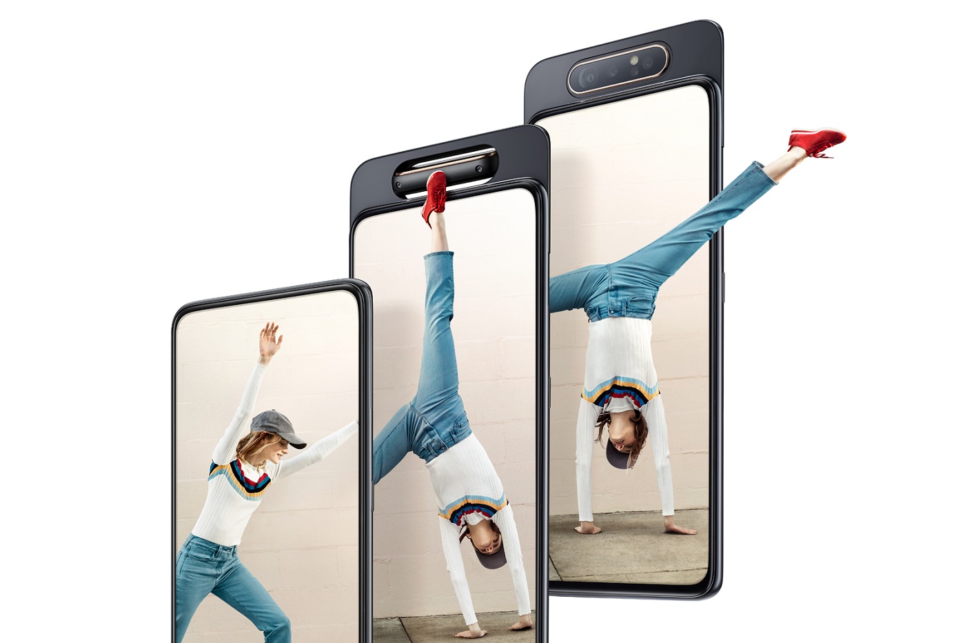 أعلنت شركة سامسونج اليوم بعد طول إنتظار عن هاتف Galaxy A80 الذي فاق جميع التوقعات بتصميمه الجريء والخلاب. وتماما مثلما أشارنا سابقا، فإن الهاتف الذي تَوَجَ سلسلة الهواتف A بتصميمه المبتكر يأتي مع كاميرا منبثقة ودوارة لإلتقاط صور عادية وأخرى ذاتية ذات جودة عالية.