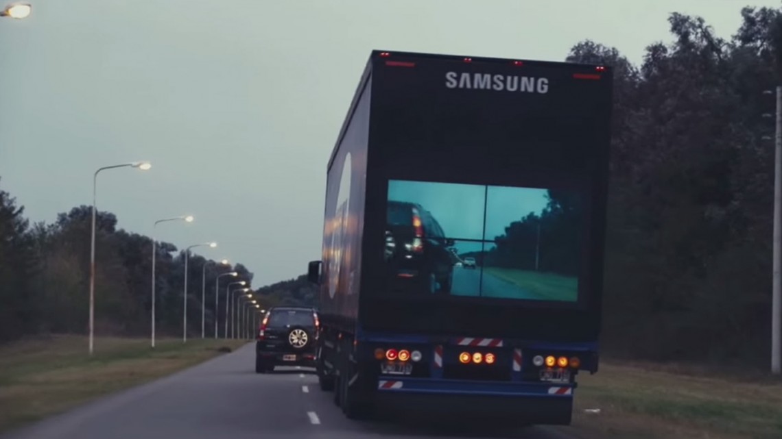 في الأرجنتين , تقع كلّ سنة العديد من حوادث الطّرقات ذات الصّلة بمجاوزة شاحنات التّوزيع الضّخمة . لهذا السّبب , إبتدعت شركة سامسونغ فكرة لامعة بتجهيز شاحناتها الضّخمة , الّتي لا تترك للسّيّارات مجالا واضحا للرّؤية , بشاشات ( LED ) عملاقة من الخلف , تتولّى إظهار كلّ ما يجري أمام العربة و ذلك بفضل كاميرا لاسلكيّة مثبّتة من الأمام .