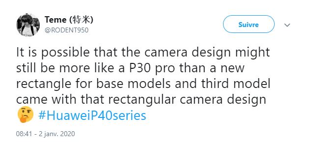 كما أوضح المسرب أن الهاتف الجديد لن يكون هاتف P40 Lite ذلك أن الهواتف الثلاثة ستكون ثلاثة هواتف رائدة مضيفا أن الإضافة الثالثة ستكون إما نسخة بورش P40 Porsche edition أو نسخة ماكس Max Edition . هذا وقال المسرب بأن وحدتي كاميرا هاتفي هواوي P40 و P40 Pro ستبقيان على تصميم كاميرا هاتف P30 Pro في حين أن الهاتف ثالث هو من سيأتي مع تصميم كاميرا مستطيلة الشكل كذلك الذي رأيناه في الصور المسربة.