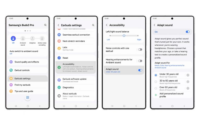 توفر واجهة ‘One UI 7’ تحسينات متقدمة لميزة [3]Adapt Sound، ما يمنحك تجربة صوتية أكثر دقة ووضوحاً أثناء المكالمات أو مشاهدة الفيديوهات. كما يمكنك تخصيص تجربتك الصوتية بما يتناسب مع قدراتك السمعية من خلال اختبار دقيق ومتقدم. أما إذا كنت تفضل الإعدادات السريعة، فيمكنك الاختيار من بين ثلاثة ملفات صوتية جاهزة مصممة لتناسب الفئات العمرية المختلفة.