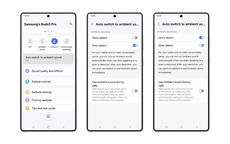 [5] تتوفر ميزات ‘Adaptive Noise Control’ و’Voice Detect’ و’Siren Detect’ حصرياً على ‘Samsung Galaxy Buds3 Pro’. يتم إيقاف هذه الميزات افتراضياً، ويمكن تفعيلها يدوياً عبر الإعدادات.