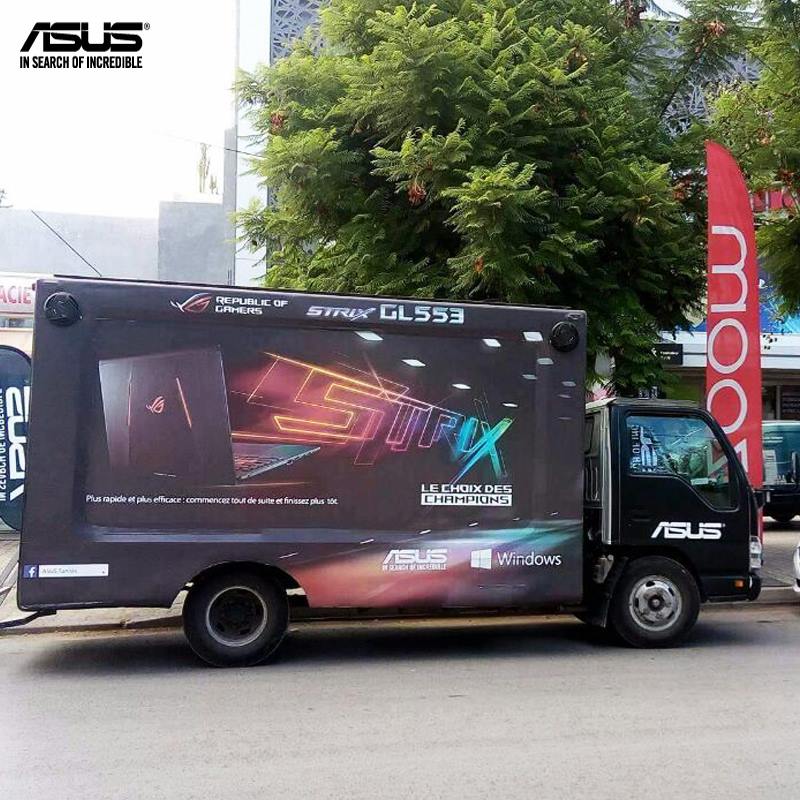 إستراتيجيّة تسويقيّة مبتكرة تتّبعها شركة Asus التّكنلووجيّة في تونس لترويج منتوجاتها المختلفة, و هي تتمثّل في شاحنة متنقّلة تحمل شعار Asus , و تحتوي على منتوجات العلامة التّايوانيّة المختلفة . من بين المنتوجات التّكنولوجيّة المعروضة من Asus , نذكر حاسوب “الغايمينغ” الأعلى أداءا في السّوق المحلّية, إلى جانب الحاسوب اللّوحي Zenbook , و سلسلة الهواتف الذّكيّة : ZenFone Go و ZenFone 3 و ZenFone 3 Max و ZenFone 3 Laser.