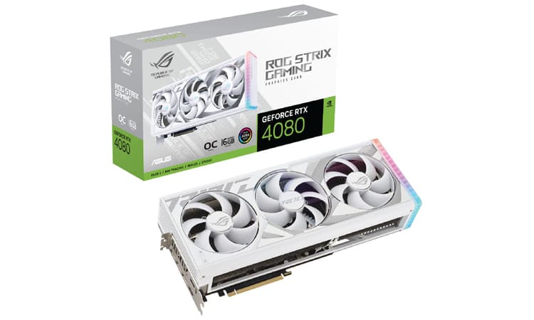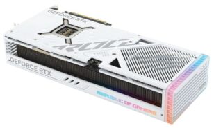 في البرنامج، يقترح علينا العملاق Asus بطاقات من فئة RTX 4080 و RTX 4090 Strix في اللون الأبيض الناصع. و بالمقارنة مع الموديل ذي اللون الأسود، نلاحظ غياب النقاط الحمراء و الزرقاء، و حضور تعرجات رمادية، مع جزء “RGB” على ظهر البطاقة.