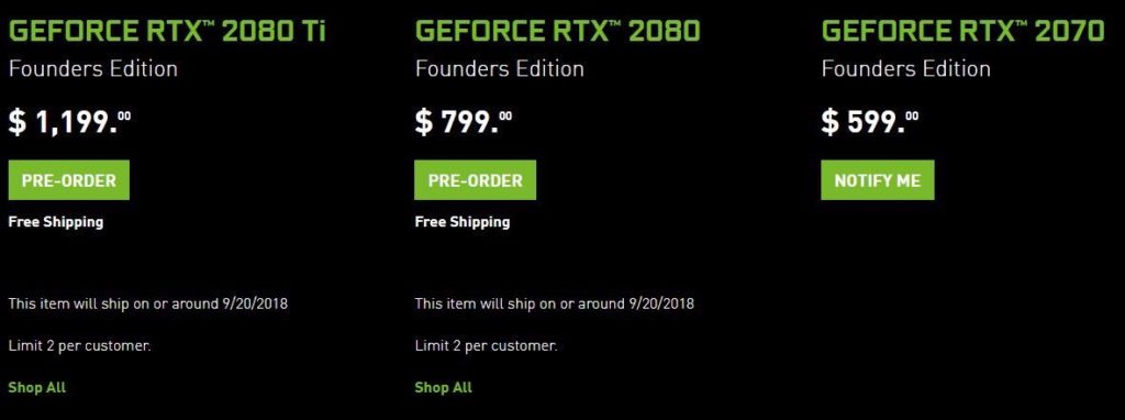 تم الإعلان عن النماذج الجديدة من بطاقات الرسوميات على الموقع الرسمي لنفيديا. بطاقات GeForce ستصدر في نهاية شهر سبتمبر القادم. ثلاثة بطاقات، هي RTX 2070 وRTX 2080 وRTX 2080 Ti، تتموقع بوضوح في القمة وتتراوح أسعارها بين 1259 يورو و639 يورو.