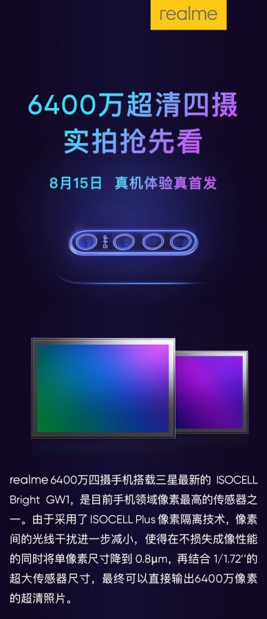 ووفقا للمنشور ، فإن وحدة كاميرا هاتف Realme 5 ستنطوي على مستشعر سامسونج ISOCELL Bright GW1 بدقة 64MP وبحجم 1/1.7 إنش. كما تشير الصور المرفقة مع المنشور إلى أن الكاميرا الجديدة ستكون قادرة على توفير صور أوضح وذات تفاصيل أفضل حتى بعد قصها أو تكبيرها. هذا وستتركب كاميرا هاتف Realme 5 الخلفية الرباعية أساسا من مستشعر رئيسي بدقة 64MP ومن عدسة ذات زاوية فوق موسعة 119° إلى جانب عدسة ماكرو ومستشعر رابع مجهول الإسم.
