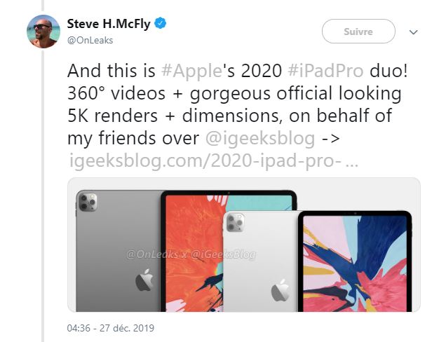نشر اليوم المسرب الشهير ستيف ماكفلاي المعروف بإسم @OnLeaks على صفحته الرسمية على موقع التواصل الإجتماعي تويتر صورا لجهازي أبل (iPad Pro 11 (2020 و (iPad Pro 12.9 (2020 المرجح الإعلان عنهما في شهر مارس القادم.