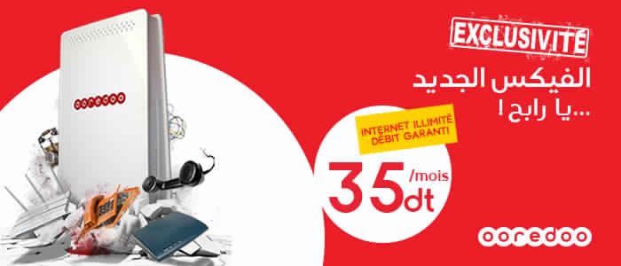 عرض “Fixe jdid” يوفّر لكم تدفّقات إنترنت سريعة ( 4 ميقا), و ذلك لمدّة 12 شهرا و دون توقّف. و للتّعرّف على كامل التّفاصيل الخاصّة بهذا العرض في صيغته الجديدة ( مقابل 35 د), بادروا بالنّفاذ إلى الرّابط التّالي أو زوروا أقرب مغازة Ooredoo منكم.